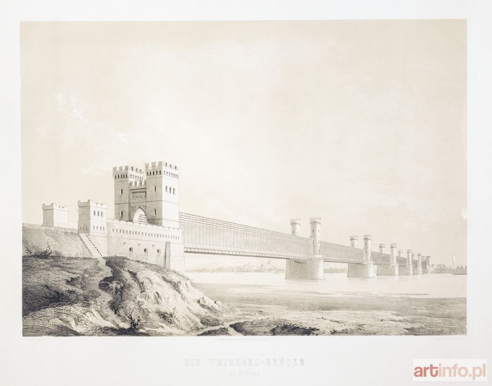Most na Wiśle, rys. i lit. Julius Greth, druk. bracia Delius w Berlinie, wyd. A.W. Kafemann, Gdańsk, ok. 1860; lit. tonowana, st. bdb., delikatne zabrudzenia, nieznaczne zagniecenia krawędzi, z prawej str. niewielkie przetarcie; wymiary widoku: 490x347 mm; DIE WEICHSEL-BRÜCKE. / bei Dirschau;