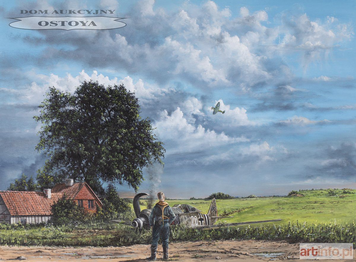 Na obrazie jest scena z II wojny światowej. Na niebie widnieje zwycięski brytyjski Spitfire, a na ziemi rozbity niemiecki Focke-Wulf