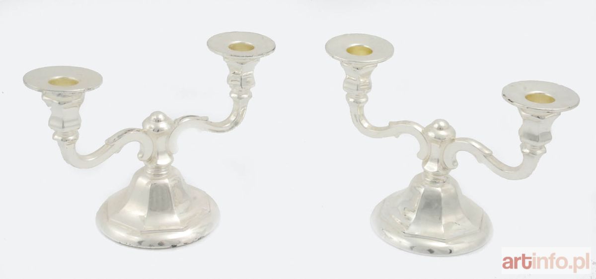 metal, tkanina; wys. 14 cm, dług. 21,2 cm; w jednej tulejce każdego świecznika znak złotnika "siedzący kot z uniesiona łapą" i cyfra „1”; Jeden świecznik na tulejkach ma plamy.