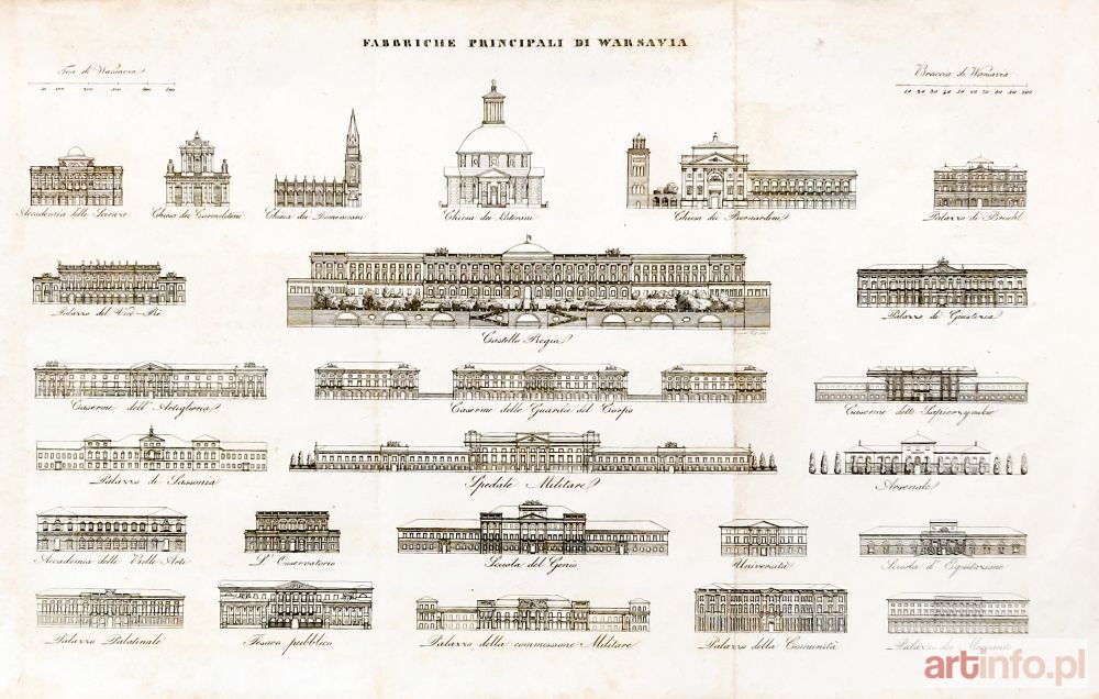 Widoki 25 warszawskich pałaców i kościołów na wspólnym arkuszu: 1) pałac Staszica – siedziba Towarzystwa Warszawskiego Przyjaciół Nauk; 2) kościół karmelitów; 3) kościół dominikanów; 4) ewangelicko-augsburski kościół św. Trójcy; 5) kościół bernardynów; 6) pałac Brühla; 7) Pałac Namiestnikowski; 8) Zamek Królewski; 9) Pałac Krasińskich; 10) Koszary Artylerii (Wołyńskie); 11) Koszary Koronne; 12) Koszary Sapieżyńskie; 13) Pałac Saski; 14) Główny Szpital Wojskowy; 15) Arsenał; 16) Oddział Sztuk Pięknych; 17) Obserwatorium Astronomiczne; 18) Szkoła Artylerii i Inżynierów; 19) Uniwersytet Królewski; 20) Giełda (Ujeżdżalnia); 21) Komisja Województwa Mazowieckiego; 22) dzisiejszy gmach Urzędu Miasta Stołecznego Warszawy; 23) Pałac Prymasowski; 24) Ratusz Główny (Pałac Jabłonowskich); 25) Dom Jarmarczny; anonim, ok. 1850; identyfikacja na podstawie: Zbiór celnieyszych gmachów miasta stołecznego Warszawy : częścią z natury zdiętych, a częścią podług istnieiących planów rysowany i litografowany przez Leonarda Schmidtnera; lit. cz.-b., st. db., rdzawe zaplamienia, złożenia książkowe; wymiary arkusza: 390x240 mm; FABBRICHE PRINCIPALI DI WARSAVIA;
