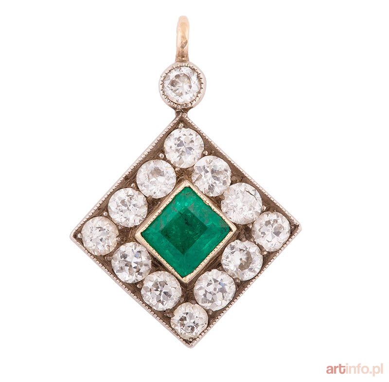 złoto pr. 0,580, m. 2,16 g, diamenty: 13 szt. łącznie ok. 1,30 ct, SI-P1/I-J, stary szlif brylantowy, szmaragd: ok. 0,30 ct, szlif schodkowy, 2,5 × 1,8 cm
