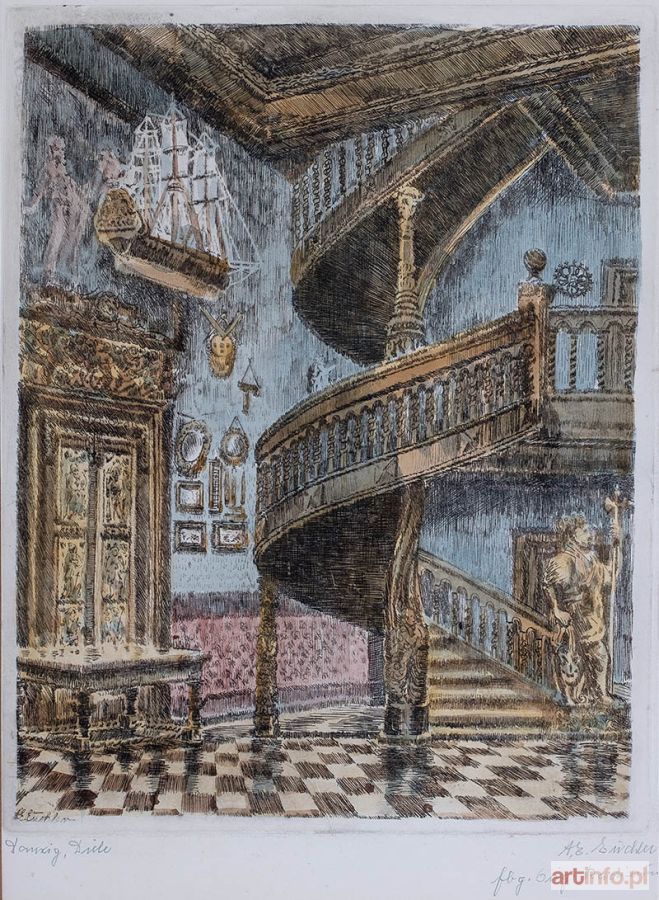 akwaforta, podmalowywana akwarelą, papier, 25 × 19,5 cm (odcisk płyty), 28,5 × 20 cm w świetle passe-partout sygn. na płycie l. d.: A.E. Eüchler; sygnatura powtórzona ołówkiem p. d.: A.E. Eüchler/(nieczytelnie) oraz l. d. ołówkiem: Danzig/Diele