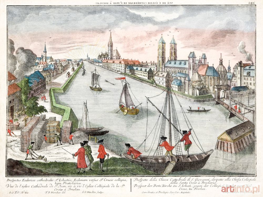 Ostrów Tumski, ryt. Georg Gottfried Winckler, rys. Friedrich Bernhard Werner, wyd. Georg Balthasar Probst, Augsburg, ok. 1760; w dole opisy w jęz. łacińskim: Prospectus Ecclesiae cathedralis St. Iohanis, Ecclesiam versus St. Crucis collegia= / tam, Vratislaviae; / Vuë de l’église Cathédrale de St. Jean, vis à vis l’Eglise Collégiale de la Ste. / Croix à Breslau; oraz włoskim: Prospetto della Chiesa Cattedrale di S. Giovanni, diripetto alla Chiesa Collegiale / della Santa Croce à Breslavia; / Prospect der Dom Kirche zu S. Iohan, gegen der Collegial Kirche zum Heil: / Creuz, zu Breslau; widok z serii Guckkastenblatt – przeznaczony do oglądania w specjalnych skrzynkach optycznych (w tzw. latarni magicznej); miedz. z akwf. kolor., st. bdb., na marginesach ślady wilgoci, w lewym dolnym narożniku brunatne zabrudzenie; wymiary widoku: 415x280 mm, wymiary płyty: ok. 443x320 mm; tyt. nad górną ramką w lustrzanym odbiciu: VUË DE L’ÉGLISE CATHÉDRALE DE ST. IEAN, À BRESLAU; [Ikonografia Wrocławia 101, Wrocław na dawnej... 224]