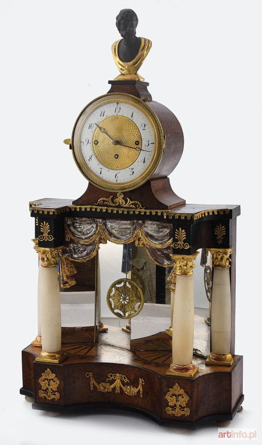 Wsparty na 6 guzikowych nóżkach toczonych z alabastru. Podstawa drewniana, prostokątna, wydłużona, o ściętych półkoliście narożach, z wklęsłym łukiem od frontu. Wyżej 4 alabastrowe kolumienki o toskańskich trzonach i korynckich głowicach z drewna złoconego. Wierzch podstawy z imitacją intarsji - malaturą o motywie pary wachlarzy w układzie symetrycznym. Tylna ścianka z czterema taflami lustrzanymi w układzie parawanowym, rozdzielonymi listwami mosiężnymi tłoczonymi w motyw laurowych listków. Górą kolumny zespolone płaskorzeźbionym, drewnianym lambrekinem - srebrzonym i złoconym. Wyżej czerniony architraw. Nad nim drewniana, cylindryczna puszka w okleinie czeczotkowej, kryjąca mechanizm z gongiem sprężynowym, bijącym godziny i kwadranse. Od frontu wypukłe, koliste szkło w ramce z brązu - osłania tarczę; podziałka godzinowa z cyframi arabskimi na pierścieniu z białą emalią; środek z brązu, giloszowany w motyw plecionki. W zwieńczeniu rzeźbione w drewnie popiersie brodatego, rzymskiego cesarza. Dodatkowo powierzchnia obudowy zdobiona nakładkami z tłoczonej blaszki mosiężnej: u dołu motyw festonów, wstążek i fruktów, po bokach gałązki winorośli; na architrawie - palmety. Wahadło z ażurową soczewką z motywem rozety.