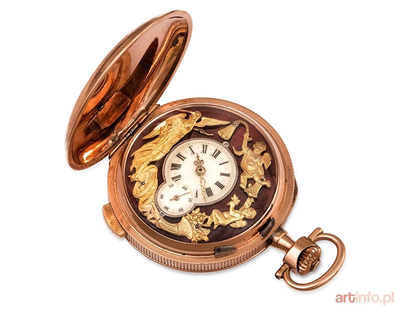 różowe złoto pr. ok. 0,580, m. brutto: 125,43 g, koperta: śr. 57 mm, nr 15323 tarcza: emalia wiśniowa na giloszu, zdobienia w postaci personifikacji Czasu i amorków (ruchome), mechanizm manualny, repetycja kwadransowa.