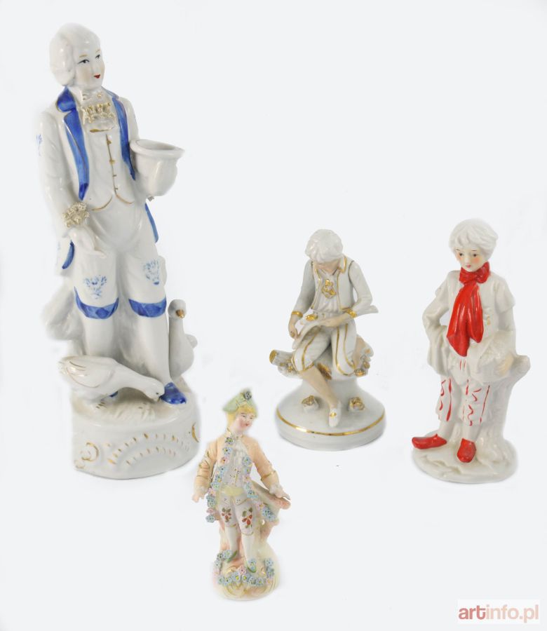 - siedzący chłopczyk: porcelana, pozłocenia; 15,5 x 8 x 8 cm; - chłopczyk w czerwonej chustce: porcelana, farby naszkliwne; 17 x 6,7 x 7 cm; - chłopczyk z gąskami: porcelana, farby naszkliwne, złocenia; 30 x 8,8 x 9,2 cm; - chłopczyk z fiołkami: porcelana, farby naszkliwne, złocenia; 12 x 4,5 x 5,5 cm; figurka była naprawiana.