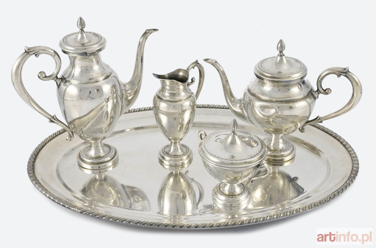 w składzie: - owalna taca: 2,5 x 49,5 x 33,5 cm; oznaczenia na spodzie: [30], w prostokącie w owalu budynek z dwoma krzyżami; - cukiernica z dwoma uchwytami z pokrywką: wys. całk. 12 cm; oznaczenia na pokrywce: [5], w prostokącie w owalu budynek z dwoma krzyżami; - mlecznik: wys. 15 cm; oznaczenia na odwrocie wylewu: [10], w prostokącie w owalu budynek z dwoma krzyżami; na uchu: ARG. 1000; - dzbanek na herbatę z pokrywka na zawiasie: wys. 19 cm; wgniecenie na brzuścu jednego boku; oznaczenia na pokrywce: [20], w prostokącie w owalu budynek z dwoma krzyżami; na uchwycie: ARG. 1000; - dzbanek do kawy z pokrywka na zawiasie: wys. 23,5 cm; drobne wgniecenie na brzuścu z jednej strony; oznaczenia na pokrywce: [20], w prostokącie w owalu budynek z dwoma krzyżami; na uchwycie: ARG. 1000; plater.