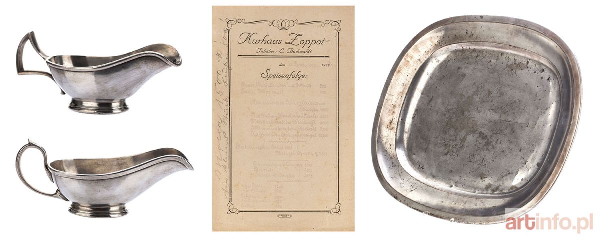 1. Półmisek, 51,5 x 41,5 cm. Na spodzie oznaczenie wytwórni: 'GEBRÜDER HEPP | METALWAARENFABRIK | PFORZHEIM | · BERLIN ·', na krawędzi kołnierza grawerunek: 'Kurhaus Zoppot' oraz oznaczenia wytwórni: '72612 GEBR HEPP 72' 2. Sosjerka, 8 x 19,5 cm. Na spodzie oznaczenia wytwórni: 'GEBRHEPP 14', grawerunek na spodzie: 'Kurhaus Zoppot' oraz oznaczenia wytwórni: '2 2' 3. Sosjerka, 7,5 x 15,7 cm. Na krawędzi podstawy oznaczenia wytwórni: 'GEBRHEPP 7', na spodzie grawerunek: 'Kurhaus Zoppot' oraz oznaczenia wytwórni: '1 | Y' 4. Menu z Domu Zdrojowego z dnia 12 lutego 1922 r., wymiary: 22,6 x 14,6 cm