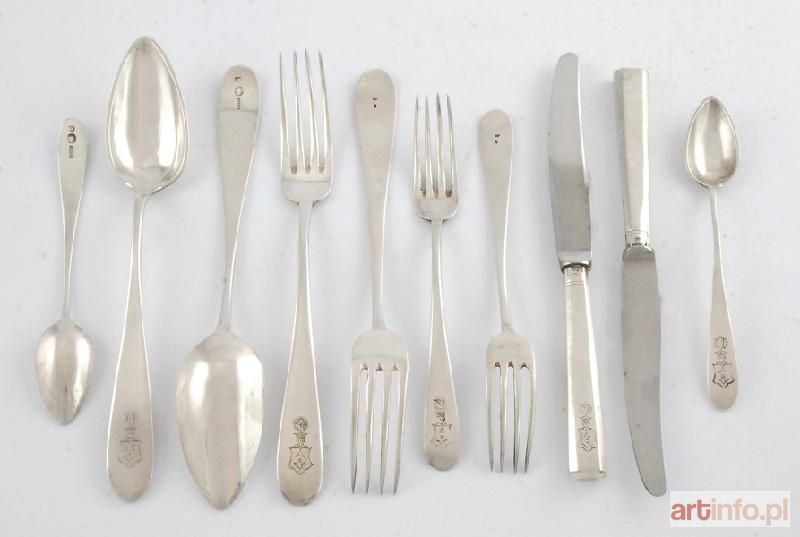 W komplecie - 6 łyżek do zupy (dł. 23,3 cm), 6 widelców i 6 noży do drugiego dania (dł. 22,6 cm i 22,7 cm), 6 widelców do przystawek (dł. 19,2 cm), 6 łyżeczek do herbaty (dł. 16,2 cm) z trzonkami wydłużonymi, płaskimi, rozszerzającymi się i zakończonymi półkoliście; noże dobierane, ostrza noży ze stali nierdzewnej, z nazwą firmy Michset oraz napisem hebrajskim, wymienione; trzonki noży dociążone, fasetowane, ścięte na końcu; na trzonkach sztućców grawerowany herb Bogoria pod koroną szlachecką; sztućce w nieoryginalnym etui introligatorskim wyłożonym niebieskim materiałem