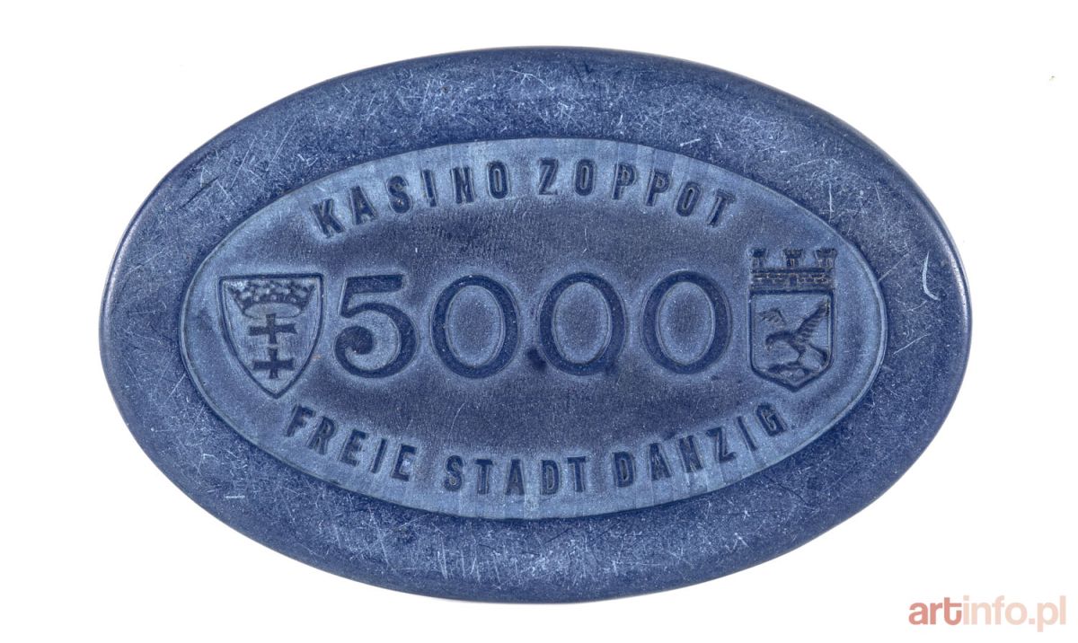 Żeton plastikowy kształtu owalnego o barwie ciemnoniebieskiej. Po bokach nominału herby Gdańska i Sopotu. Liternictwo proste. śr: 4,5 cm