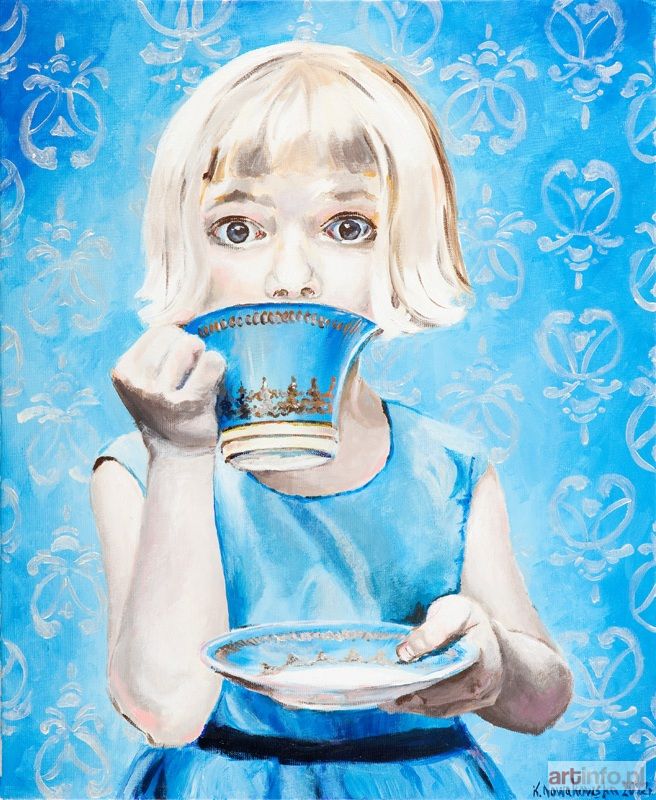 akryl/płótno, 61 x 50 cm sygnowany p.d.: `K. Nowakowska 2012r.` na odwrociu opisany: `KATARZYNA NOWAKOWSKA ŚRODOWSKA | " DZIEWCZYNA Z FILIŻANKź" 61X50 | 2012 AKRYL NA PŁÓTNIE`