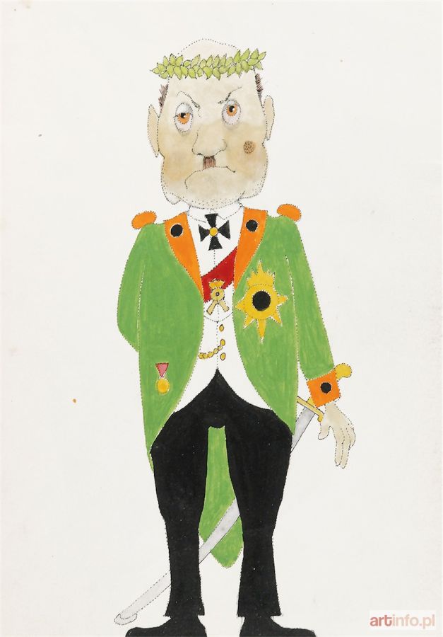 ołówek, piórko, tusz, akwarela, gwasz, papier; 22,7 x 16 cm Projekt kostiumu do przedstawienia "Bumbarasz" (Teatr Lalki, Maski i Aktora Groteska, Kraków, 1977 - na motywach powieści Arkadego Gajdara, reż. Fred Leniewicz, maski K. Mikulski)