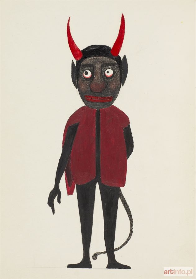 Rysunek, tusz, tempera, karton, 23 x 16,2 cm, nie sygn., na odwrotnej stronie inskrypcja autorska: Smolka / (maska). Proj. do "Przyszliśmy tu po kolędzie..." (Szopka krakowska).