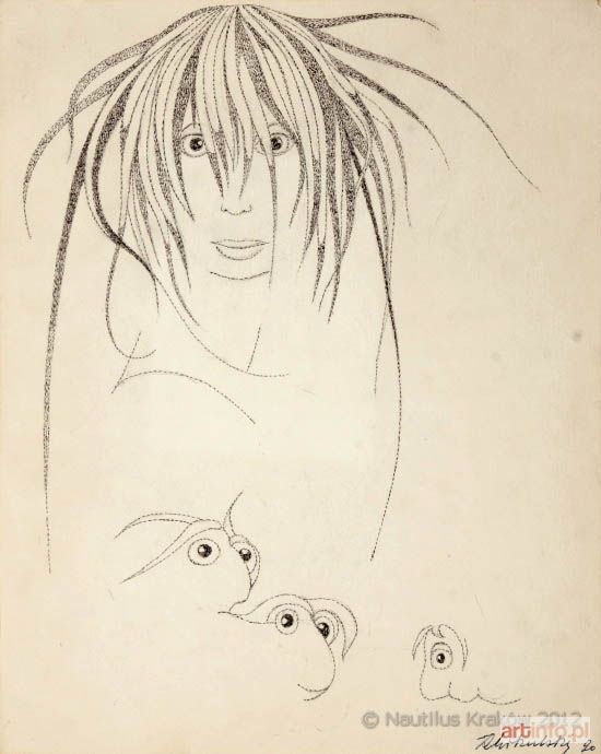 Tusz, ołówek; wym.: 30 x 24 cm; sygn. długopisem p.d.: K. Mikulski 90. Na odwrocie opis artysty. Praca ze zbioru F. i B. Kędziorków (na oprawie opis kolekcjonerski).