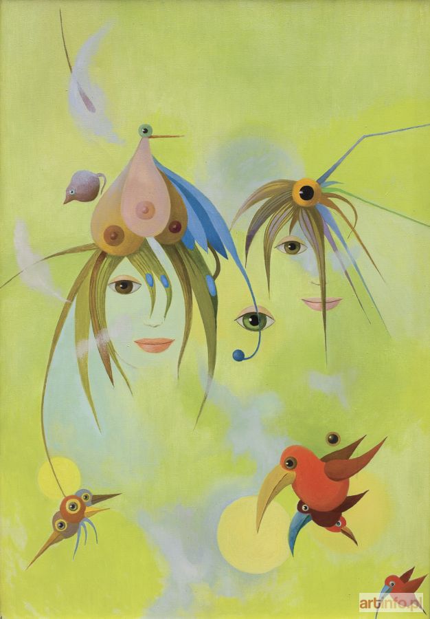 olej, płótno 92,5 x 65 cm sygn. na odwrocie na płótnie: Kazimierz Mikulski | Kraków 1986 | "Igraszki trzeciego stopnia" na płótnie ślad podłużnej pieczątki