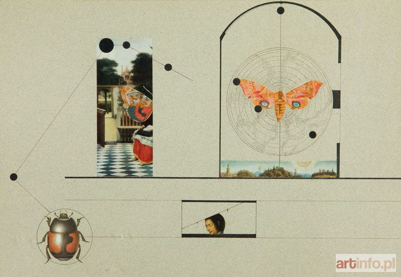 kolaż, technika mieszana/tektura, 29,8 x 43,4 cm sygnowany, datowany i opisany na odwrociu: 'K.Mikulski / dzień owadów / 75'