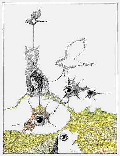 Na odwrocie potwierdzenie autentyczności wystawione przez Agnieszkę Mikulską, 1990 r. Malarz, rysownik, scenograf, poeta. Od 1938 r. studiował malarstwo w krakowskiej Akademii Sztuk Pięknych pod kierunkiem P. Dadleza, K. Sichulskiego. Naukę kontynuował w Kunstgewerbeschule w pracowni F. Pautscha. Był członkiem "Grupy Młodych Plastyków", a od 1957 r. reaktywowanej "Grupy Krakowskiej". Uczestniczył w Wystawach Sztuki Nowoczesnej w 1948 r., 1957 r. i 1959 r. Był aktorem w okupacyjnym teatrze T. Kantora, a później teatrze "Cricot 2". Stylistyka dzieł Mikulskiego odwołuje się do surrealizmu, sennego marzenia, erotyki.