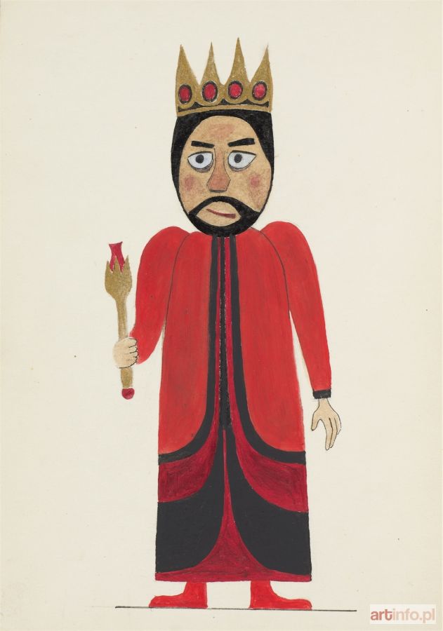 Rysunek, tusz, tempera, karton, 23 x 16,2 cm, nie sygn., na odwrotnej stronie inskrypcja autorska: Herod / (maska). Proj. do "Przyszliśmy tu po kolędzie..." (Szopka krakowska).