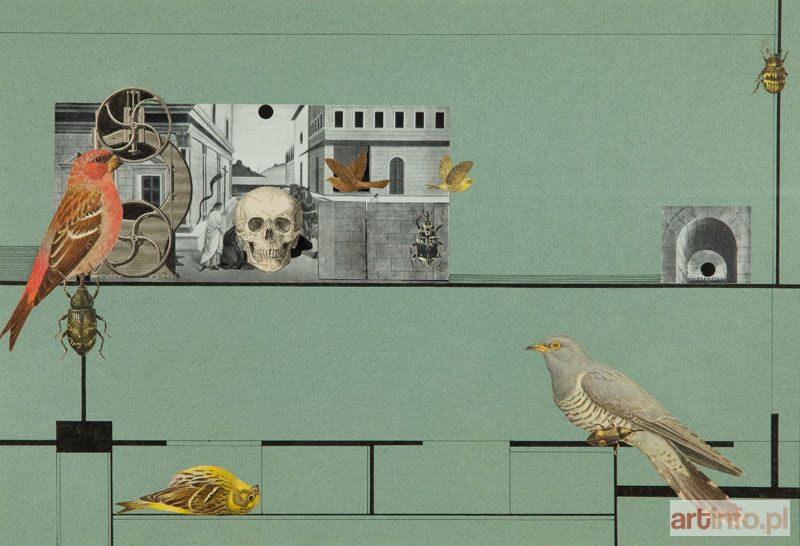 kolaż/tektura, 29,5 x 43,5 cm (w świetle passe-partout) sygnowany na odwrociu: 'Kazimierz Mikulski / Martwy ptak / Kraków 1974 / collage papier'