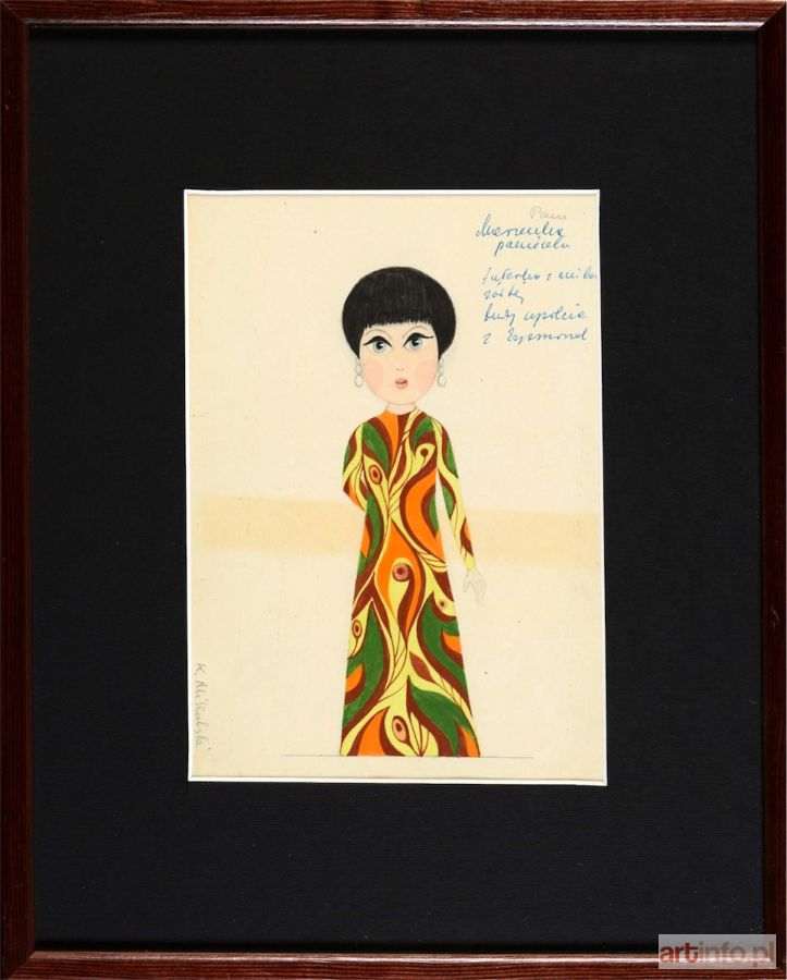 gwasz, ołówek, papier; 21,8 x 15,4 cm w św. p-p.; sygn. lewy bok: K. Mikulski napis p. g. (częściowo czytelny): Pani / Marzenka / panienka / futerko z… / żółtą / buty wysokie / z Eysmond