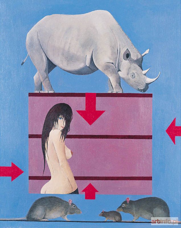 olej, płótno, 92 x 73 cm sygn. na odwr. p.g.: Kazimierz Mikulski | Kraków 971, l.d.: NOSOROŻEC ZNOWU | TUPIE NA STRYCHU, na g. żerdzi krosien l. numer czarnym flam.: Nr. 2136/M/71, śr. oł.: SDP N 3337