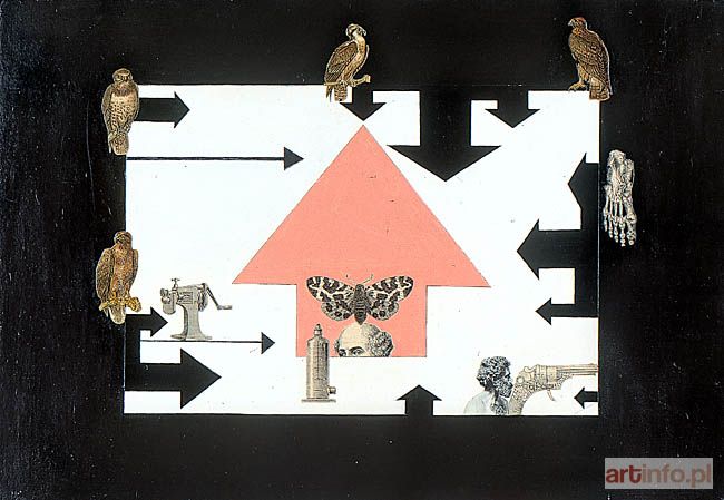 olej, kolaż, 36 x 51 nie sygnowany; na rewersie napis: "Osaczenie" / collage / Kazimierz Mikulski / Kraków 1973.