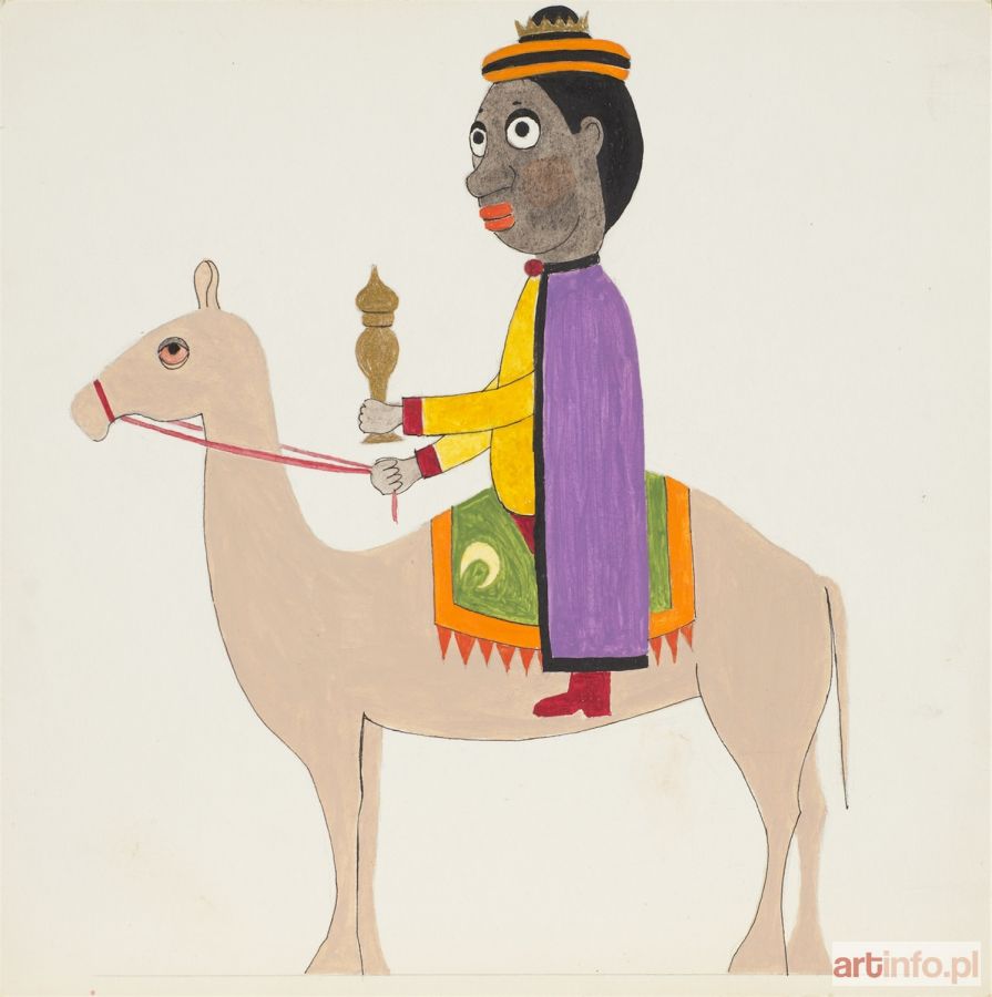 Rysunek, tusz, tempera, karton, 23,1 x 23,1 cm, nie sygn., na odwrotnej stronie inskrypcja: "Przyszliśmy tu po kolędzie" / proj. lalki-kukiełka / z grupy trzech króli. Proj. do "Przyszliśmy tu po kolędzie..." (Szopka krakowska).