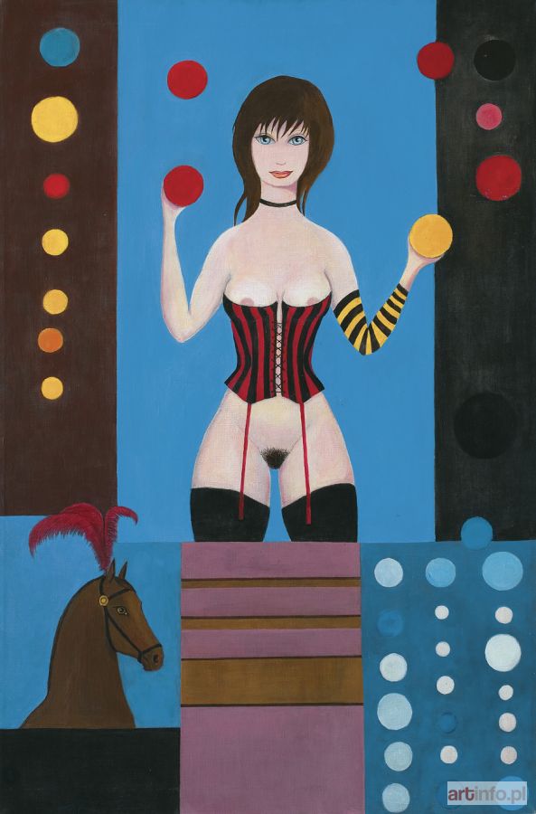 olej, płótno 90 x 60 cm sygn. na odwrocie na płótnie p.g.: KMikulski | Kraków 67 l.d.: Próba w Lunaparku na p. listwie krosna nalepka: MIKULSKI KAZIMIERZ | POLEN [maszynopis] 31. [czerwonym atramentem] 25 [oł., przekreślone] na płótnie i blejtramie podłużne pieczatki zezwalające na wywóz za granicę oraz nalepka informacyjna