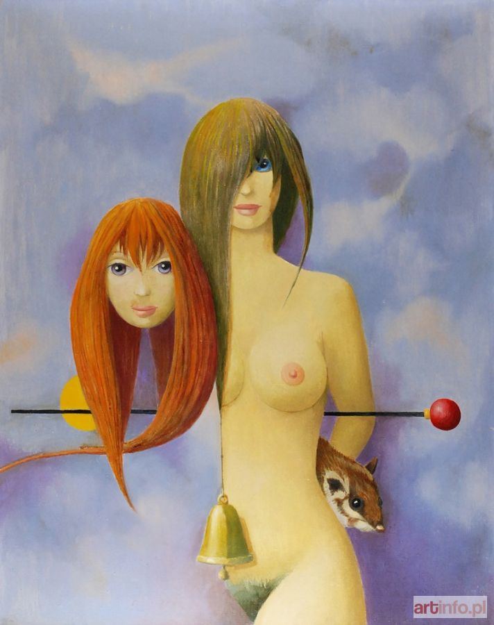 Przentujemy obraz Kazimierza Mikulskiego czołowego przedstawiciela polskiego malarstwa metafizycznego. Artysta w latach 50-tych zaczął malować w charakterystycznej dla siebie baśniowej stylistyce. Odrzucił abstrakcję, skupił się na figuracji tworząc m.in.: postacie ludzkie, baśniowe stwory, zwierzęta. Bohaterom swoich obrazów nadawał rolę narracyjną. Wymowa jego prac wydają się nierealistyczna, sielska, przepełniona magią. Jest to jednak pierwsze, złudne wrażenie. Po zetknięciu się z twórczością Mikulskiego i wejściu głębiej w warstwy obrazu odkrywa się wielowątkowość, symbolikę i istotne prawdy, skryte pierwotnie przez autora. Znaczenie odsłania się powoli, często drogowskazem może być tytuł, występujące w obrazie, rekwizyty czy relacje bohaterów względem siebie. W proponowanej Państwa uwadze pracy przedstawione są dwie dziewczyny - tytułowe "strażniczki" postacie o wielkich oczach, długich włosach przypominające kukiełki z teatru lalek. "Strażniczka" stojąca z lewej strony ukazana jest jakby w połowie sylwetki, obok niej unosi się głowa drugiej, rudowłosej kobiety. Milczące bohaterki, ukazane na tle błękitnego nieba, wydają się przepełnione ciszą, przypominając bohaterów dziecięcych bajek. Wyposażone w oręże - rekwizyty - różdżkę cyrkowa, dzwonek i łasiczkę wyglądającą za pleców, dają się ponieść wyobraźni widza, co do ich roli. W prezentowanym obrazie zawarte są najważniejsze cechy malarstwa artysty: nasycone kolory, układ, wyrwanie postaci z naturalnego dla nich otoczenia i umieszczenie w nowym, bajkowym środowisku. Praca charakteryzuję się również lirycznym erotyzmem będąc doskonałym przykładem twórczości Kazimierza Mikulskiego.