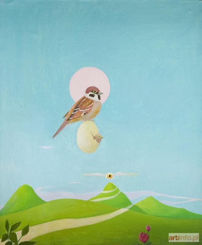 akryl/płótno, 46 x 28 cm sygnowany, datowany i opisany na odwrociu, na płótnie: '"Wróbel i róża" | KMilulski | Kraków 94' na odwrociu nieczytelny stempel wywozowy opisany na górnej listwie krosna: '38 x 46', obok: 'WRÓBEL I RÓŻA'