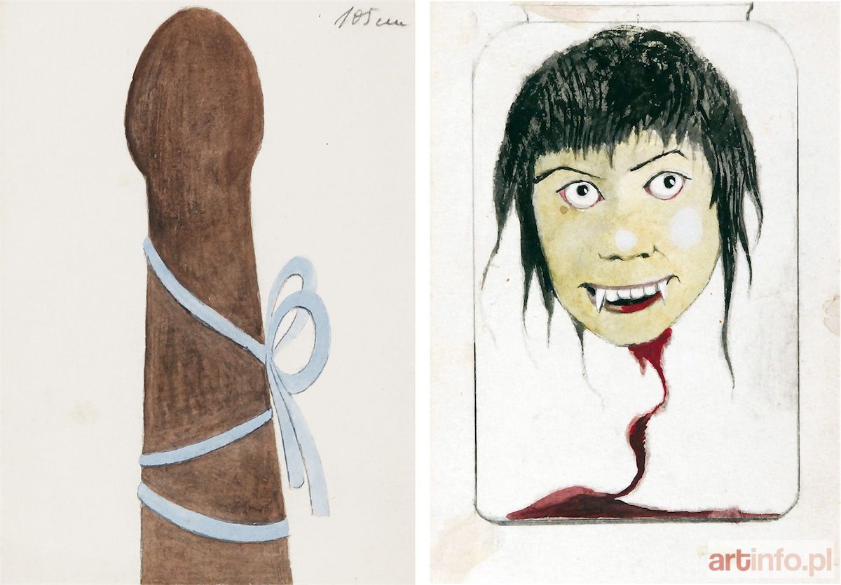 Głowa wampira w słoiku ołówek, piórko, tusz, akwarela, gwasz, papier; 16,2 x 11,6 cm Fallus w niebieskiej kokardce ołówek, piórko, tusz, akwarela, gwasz, papier; 16,1 x 11,5 cm; napis ołówkiem p. g.: 105 cm