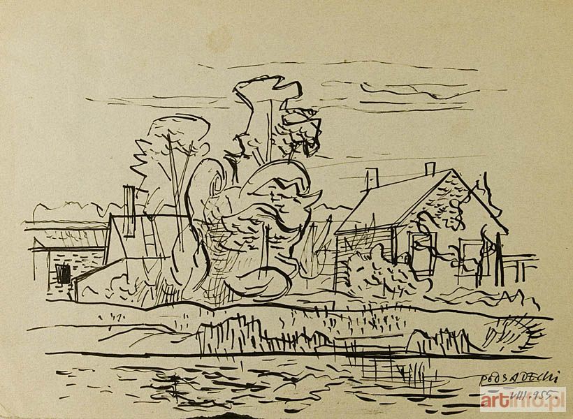 Tusz, piórko, karton; 25,9 x 35,4 cm Sygnowany p. d.: PODSADECKI/ VIII. 955