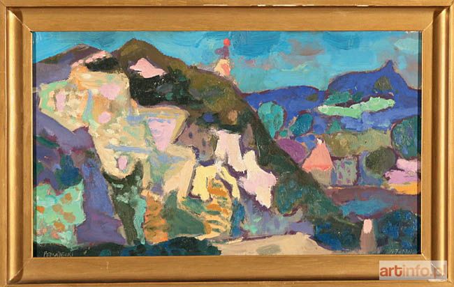 olej/płyta, 27 x 46 cm sygnowany l. d.: `Podsadecki`; na odwrocie napis: `Kaz. Podsadecki | 1962 | Kamieniołom w Mydlnikach | 46 x 27 | Tempera olejna`
