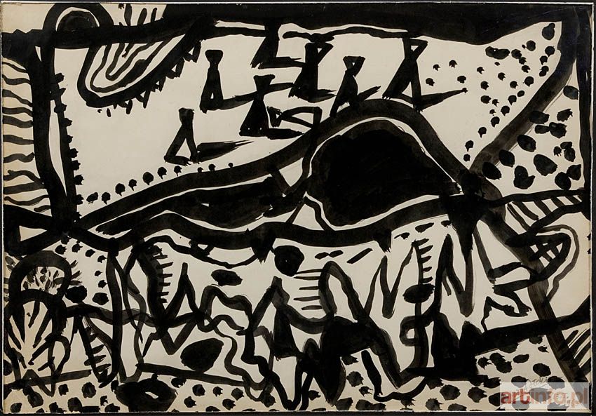 Tusz, papier; 33 x 48 cm w świetle passe-partout Sygnowany ołówkiem p. d: PODSADECKI | 13. I. 1963 Na odwrocie wykonany przez artystę napis niebieską kredką: "KRAJOBRAZ ZE SNOPKAMI"