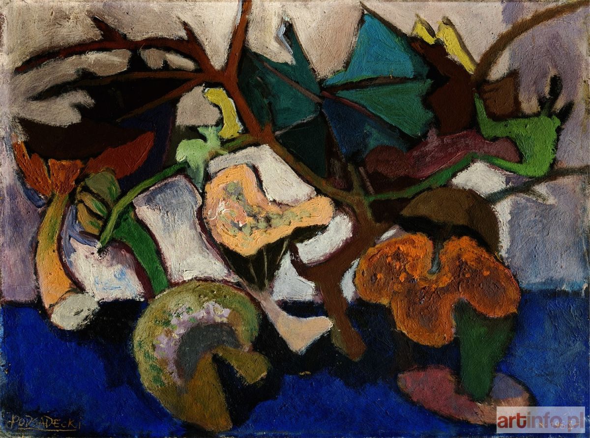 tempera, olej, pilśń; 37 x 50 cm; sygn. l. d.: PODSADECKI (podkreślone) oraz dat. p. d.: IX.1963; Z tyłu napisy kredką: K. PODSADECKI 1963 / „Gołąb i grzyby” / temp. olej na pilśni / 50 x 37