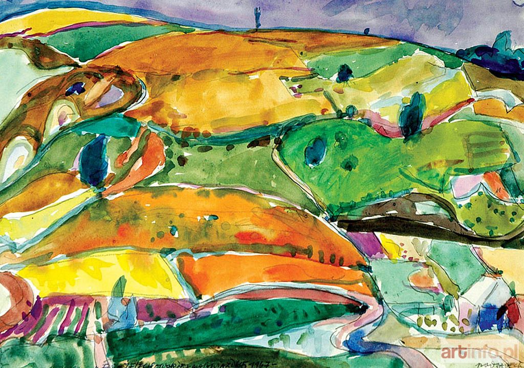 akwarela na podrysowaniu ołówkiem, papier, 24,5 x 35 cm (w świetle oprawy); sygn. p.d.: PODSADECKI (ołówkiem), napis l.d.: 14.7.967 - p. EWIE ŻELECHOWSKIEJ NA GWIAZDKĘ 1967 -