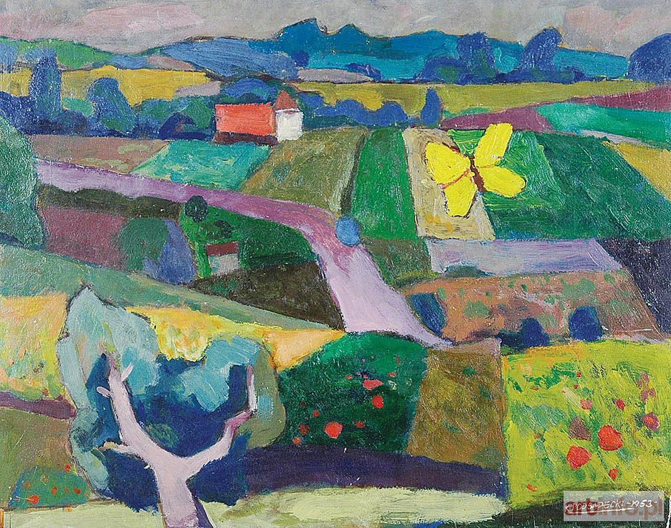 olej, sklejka, 51 x 65 cm; sygn. p. d.: K. PODSADECKI -1953- Na odwrocie opis autorski: 1953 / 65 x 51 / PODSADECKI KAZIMIERZ / "POLA" / 1953 / TEMPERA OLEJNA; oraz (WITKOWICE pod KRAKOWEM) / 1953