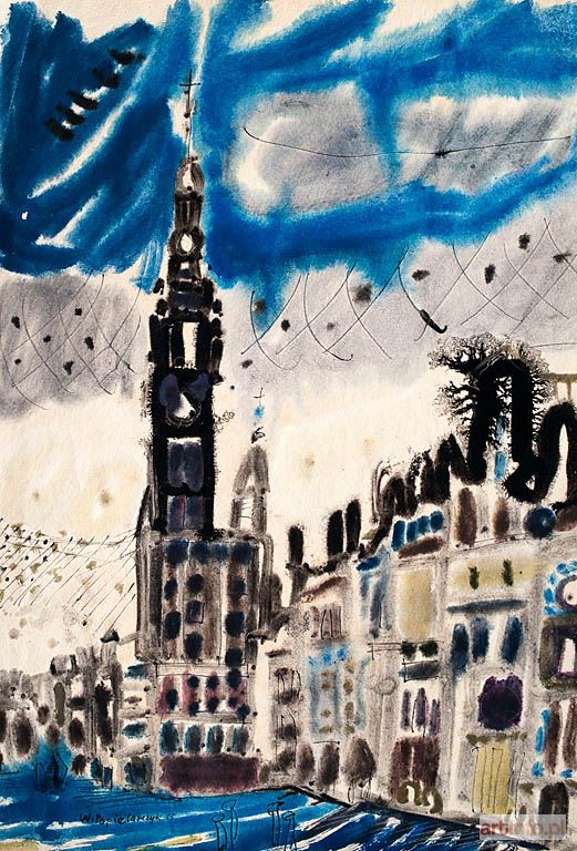 Akwarela, tusz, papier; 42 x 29,5 cm Sygnowany l.d.: W. POPIELARCZYK 65 Na odwrocie napis ołówkiem wykonany przez artystę: Władysław Popielarczyk | "Ratusz" | 1965