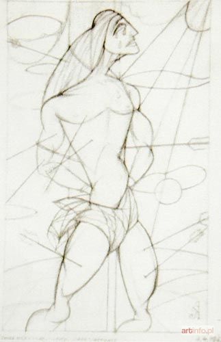 ołówek, papier, 35 x 23 cm; sygn. p.d.: KP (monogram wiązany) U dołu z lewej napis: TŁO CIEMNE BŁĘK + CZAR.+ ZŁOTO - CIAŁO BIAŁOSZARE; z prawej data: 1.4.1965