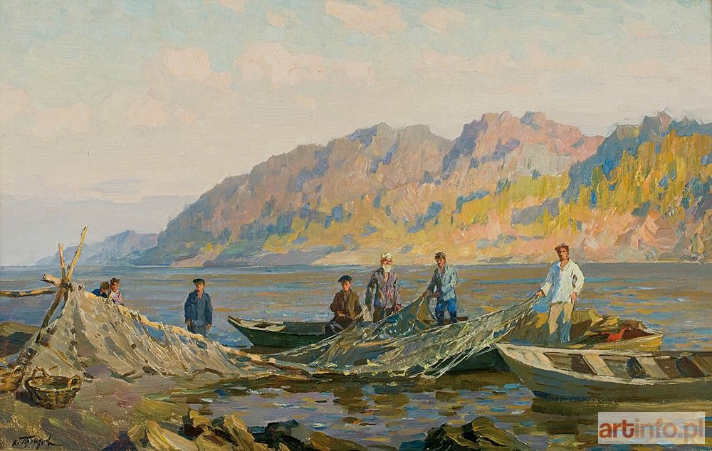Zasłużony artysta USRR. Zasłużony artysta Federacji Rosyjskiej. Kształcił się w Szkole Artystycznej (?????????????? ???????) w Palechu, a następnie w Iwanowie (1940-46) u M. Pyrina, A. Kuzniecowa i L. Sherwooda. W roku 1942 został powołany do wojska - walczył na froncie II Wojny. W 1948 ukończył Szkołę Artystyczną w Symferopolu (w latach 1949-54 był w niej wykładowcą). Od tego też roku jest członkiem Związku Artystów ZSRR. Studiował zaocznie w Leningradzkim Instytucie Malarstwa, Rze¼by i Architektury im. I. Je. Repina (dawnej Akademii Sztuk Pięknych) oraz pracował w Krymskiej Okręgowej Galerii Obrazów. Dwie z jego prac eksponowanych na Wszechzwiązkowej Wystawie Sztuk w 1955 - otrzymali w prezencie od rządu ZSRR - premier Indii Nehru i jego córka Indira Gandi. W latach 1955-58 był przewodniczącym krymskiego okręgu Związku Artystów USRR. Wystawiał swoje prace na wystawach indywidualnych w Moskwie, Kijowie, Symferopolu, Sewastopolu oraz za granicą, w tym w Polsce. Obrazy artysty znajdują się w zbiorach muzealnych Rosji i Ukrainy (jako zakup Ministerstw Kultury obu krajów) a także w zbiorach prywatnych m.in. w Wielkiej Brytanii, Francji, Japonii. Podróżował po Rosji (w tym Syberii) i Europie. Od roku 1974 mieszka pod Moskwą w okolicach Dmitrowa. Prezentowany obraz przedstawia grupę rybaków stojących w łodziach i na brzegu - wciągają do łódki sieci, które suszyły się na brzegu. Scena umieszczona jest w zatoce morskiej - najprawdopodobniej na Krymie. Wysoki skalisty brzeg oświetlony jest przez wschodzące słońce.