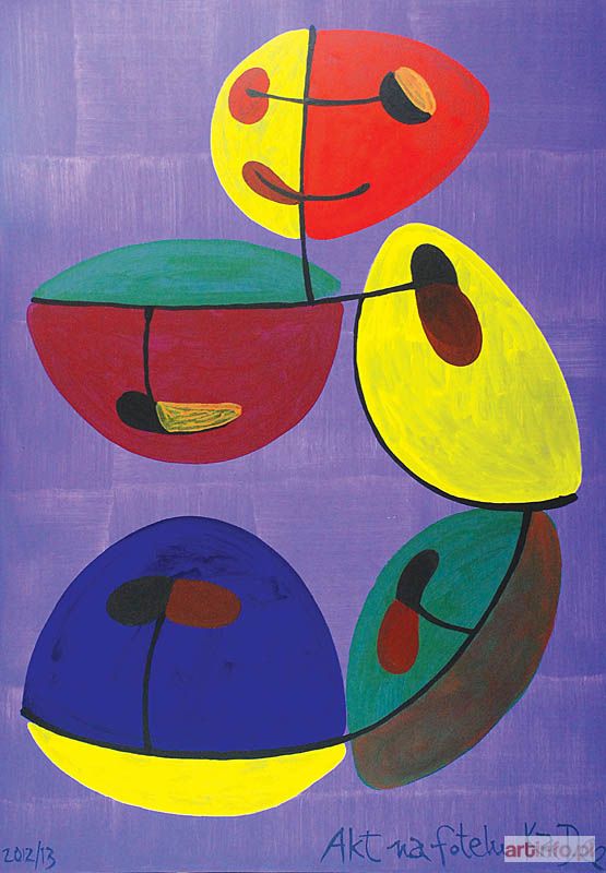 akryl, płótno; 100 x 70 cm; sygn. p. d.: Akt na fotelu KaDee data l. d.: 2012/13 na odwrocie napisy autorskie: Krzysztof Dudziński/ KaDee/ t. Akt na fotelu/ akryl 100 x 70 cm/ 2012/13