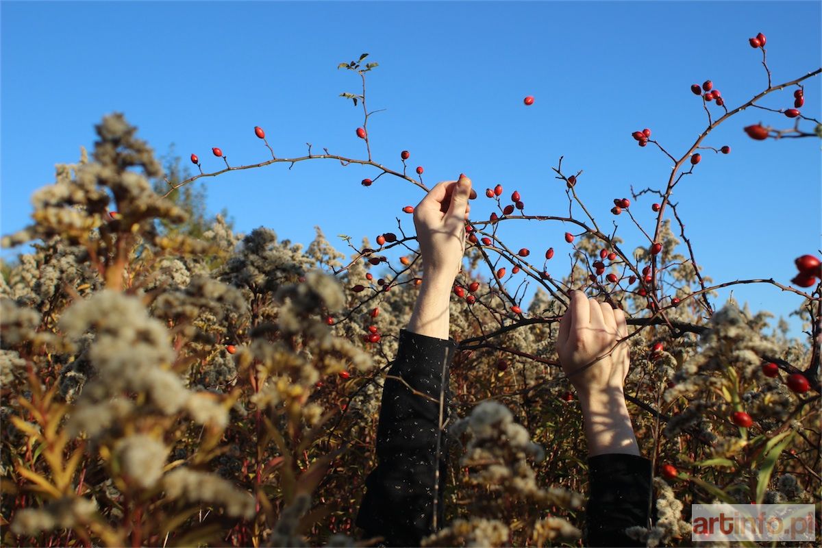 Początkiem ostatniego tygodnia października w godzinach popołudniowych, kiedy większość sąsiadów i znajomych była jeszcze w pracy, postanowiłem pozbierać dziką różę, na wino. W ten dzień, na górce gdzie mieszkałem czuło się pustkę. Wszystko, co się ruszało za sprawą lekkiego wiatru i ostrych promieni słońca, blado padających na pomarańczowe liście brzóz i drgające trawy, oscylowało na granicy złudzenia. Martwo. (...) Fotografia, którą wykonałem, dokumentuje czynność zbierania owoców, która dla mnie, przez wysiłek a przede wszystkim intencję stała się prywatnym performansem. Przynajmniej przez moment. Całej sytuacji zbioru nie odbieram prozaicznie, a jako próbę zbliżenia się do intrygującej mnie struktury. Subtelnego penetrowania, naruszania, zmiany przestrzeni, również tej kolorystycznej. Atencji. Tę wydawałoby się zwyczajną sytuację, która jednak należy w dzisiejszych czasach do ekscentrycznej, przenoszę w sferę rytuału, osadzonego w cykliczności pór roku. To, co najważniejsze - zbieranie owoców, wydaje się pełnym dramaturgii zdarzeniem, a wyestetyzowane tło, areną zmagania się z dzikim terenem i dziką, ale za to nieskażoną przydrożnymi zanieczyszczeniami różą.