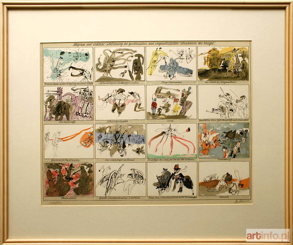 Praca przedstawia szesnaście oddzielnych kwater. Każda z osobna ukazuje okropności rozgrywające się podczas wojny, które artysta przedstawił z charakterystycznym dla niego uproszczonym rysunkiem. Dodatkowo, każda scenka posiada własny tytuł, jak na przykład: Rozstrzelanie, Szczątki, Podniebna Wojna.