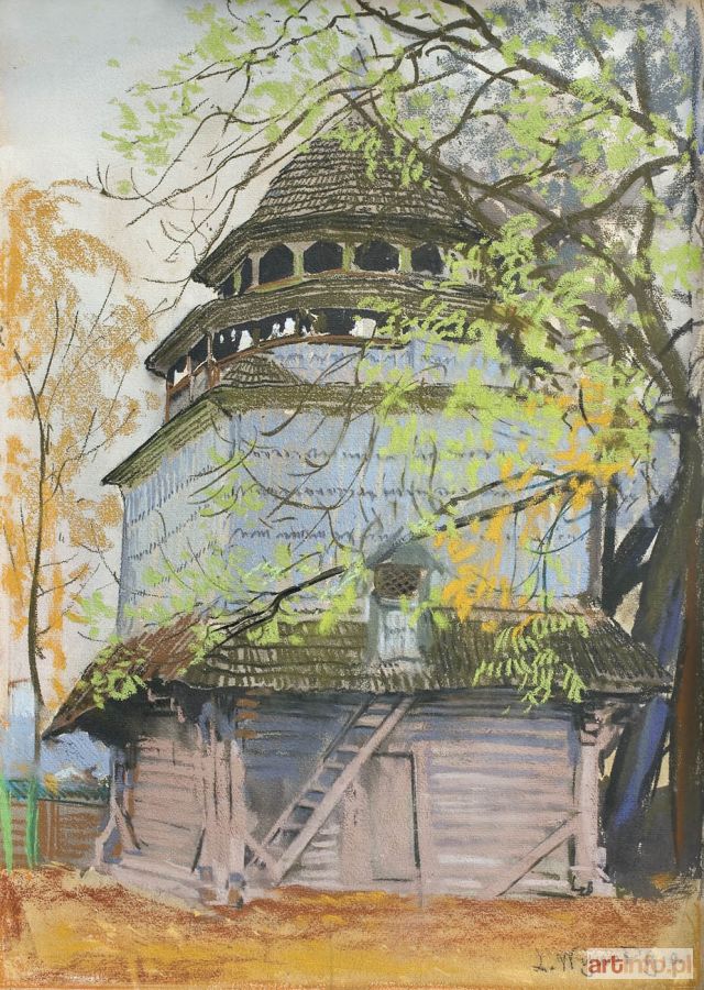 (KAPLICZKA) pastel, gwasz, papier 69 x 49,5 cm sygn. p.d.: L. Wyczoł 910 "Plecy" oklejone gazetą (krakowski "Czas" 1910). U góry trzy nalepki wystaw w warszawskim Towarzystwie Zachęty Sztuk Pięknych (druki wypełnione atramentem, stemple): - o treści: 16748 Autor Leon Wyczółkowski | Tytuł Jaremcze XIII Rodzaj dzieła pastel | Cena - Własność - Data nadesłania ..., - o treści: 18291 Autor Wyczółkowski Leon 18291 | Tytuł Kapliczka wykonanie pastel | Cena - Właściciel [papier oddarty; tekst nieczytelny] Data 10/VI 31, - o treści: 41607 Autor Wyczółkowski Leon 41607 | Tytuł Kapliczka wykonanie - | Cena - [papier oddarty; tekst nieczytelny] Data SIER. 1937 Dawna własność: p. Marta Bendetsonowa (zm. 1944).