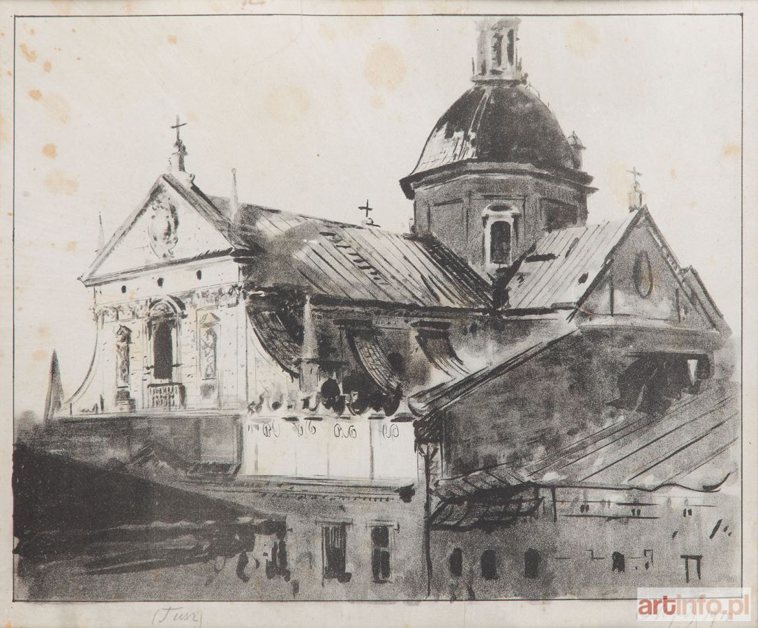 na odwrociu papierowa naklejka Salon Dzieł Sztuki Kazimierza Wojciechowskiego z danymi: 'Data przyjęcia: 1936 | Autor: Prof. Leon Wyczółkowski | Tytuł: Kościół św. Piotra i Pawła | Rodzaj: autolitografia | Nr. 8546'