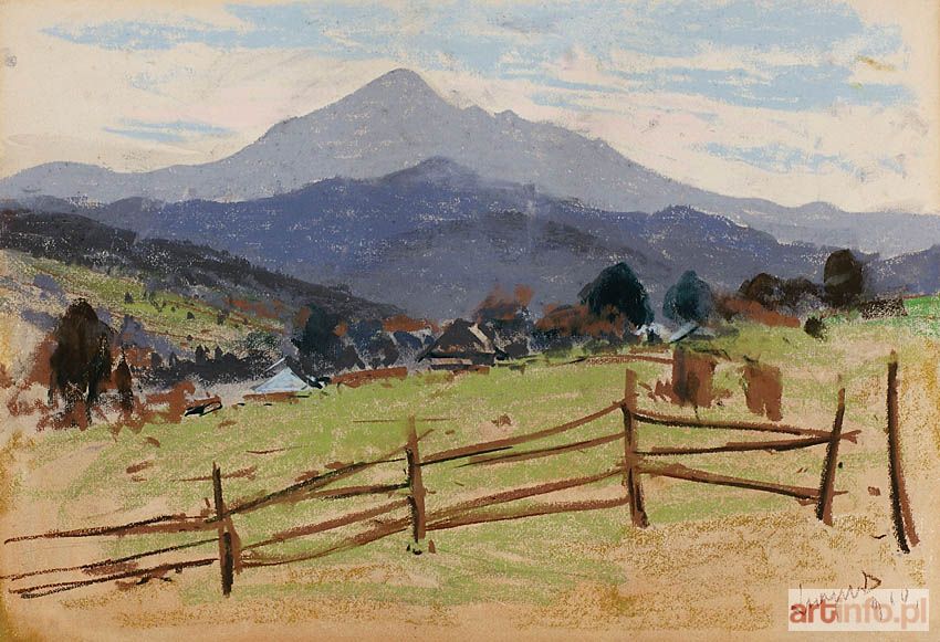 Leon Wyczółkowski, malarz, pastelista i akwarelista, odnowiciel i mistrz litografii polskiej, pedagog, jeden z najważniejszych twórców epoki Młodej Polski; artysta przywiązujący wielką wagę do doskonałości swego (niejednokrotnie eksperymentalnego) warsztatu. Naukę malarstwa rozpoczął w warszawskiej Klasie Rysunkowej Wojciecha Gersona (1869-74), by kontynuować ją w Akademii monachijskiej u Alexandra Wagnera (1877-79) oraz w oddziale kompozycji krakowskiej Szkoły Sztuk Pięknych pod opieką Jana Matejki (1877-79). Po kilku latach podróży po Wołyniu, Ukrainie i Podolu w 1895, w związku z otrzymaniem profesury macierzystej Szkoły (od 1900: Akademii) osiadł w Krakowie (zasadniczo do 1929). Czas I wojny światowej przetrwał głównie w Warszawie. Ostatni okres życia spędził między Poznaniem, Gościeradzem pod Bydgoszczą i Warszawą, gdzie w Akademii Sztuk Pięknych wykładał pochłaniającą go wówczas niemal bez reszty grafikę. Należał do grupy założycieli Towarzystwa Artystów Polskich "Sztuka". Prezentowany, nadzwyczaj dobrze zachowany (dzięki profesjonalnemu oprawieniu natychmiast po powstaniu) pastel nie przynależy - wbrew pierwszemu wrażeniu - do "serii" widoków tatrzańskich, rozwijanej aż do końca 1909, lecz powstał wiosną roku następnego, podczas podróży (1910/11) przedsięwziętej przez artystę na Huculszczyznę i Bukowinę, aż do podnóża Gorganów (m.in.: Suczawa, Jaremecz, Jabłonka, Worochty), której artystycznym plonem stało się z górą sześćdziesiąt pejzaży i widoków architektonicznych, które zaskakująco - jak nasz - łącząc brawurowo gwasz (lub akwarelę) z rysunkiem pastelem, spotkały się, mimo swego poziomu artystycznego z tak zajadłą krytyką Feliksa Jasieńskiego "Mangghi", że dużą ich część Wyczółkowski zniszczył (zob.: Leon Wyczółkowski, Listy i wspomnienia, oprac. M. Twardowska, Wrocław 1960, s. 106-107 [Źródła do dziejów sztuki polskiej, pod red. A. Ryszkiewicz, T. XI]). Mimo to na pośmiertnej wystawie monograficznej w 1937 udało się zgromadzić ich jeszcze osiem (por.: Leon Wyczółkowski 1852-1936. Dzieła malarskie, Towarzystwo Zachęty Sztuk Pięknych w Warszawie, wrzesień 1937, przewodnik [nr] 125, poz. 110-117, s. 37-38), wszystkie prawie identycznych z naszym wymiarów; kolejny (albo identyczny z jednym z nich - ibidem, poz. 114, s. 38) był 14 lutego 2004 r. oferowany na 32 aukcji Domu Aukcyjnego "Ostoya" (Katalog, poz. 5).