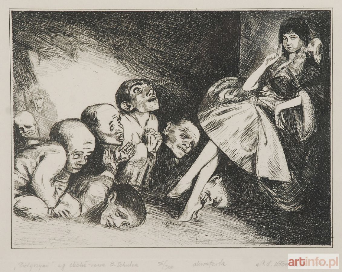 akwaforta, papier; 17 x 23 cm (odcisk płyty 19 x 25 cm); sygn. i dat. ołówkiem p. d.: M.L.Włodarska 1991 napis ołówkiem. l. d: "Pielgrzymi" wg cliché-verre B. Schulza 56/300 akwaforta.