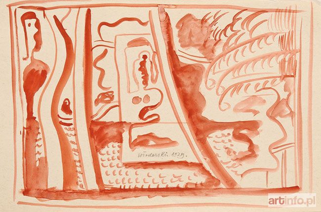 akwarela na papierze naklejonym na papier z ramką, 20,7 x 31 cm, sygnowany ołówkiem pośrodku kompozycji (wtórnie przez autora): "Włodarski. 1929". Z pracowni artysty. Wystawiany: "Marek Włodarski?". Wystawa monograficzna. Muzeum Narodowe, Warszawa 1981/1982, w katalogu poz. IV/468.