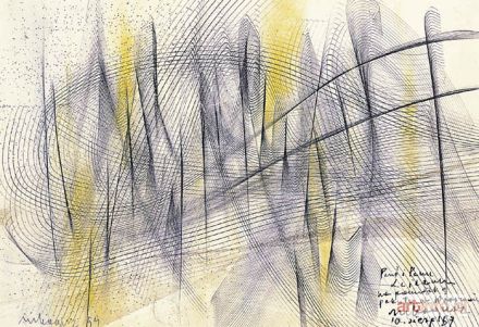 kredka, akwarela, papier, 20 x 29 cm kredka, akwarela, papier kremowoszary, 20 x 29 cm (w świetle passe-partout) sygn. czarną kredką l.d.: mbogusz 59 dedykacja tuszem p.d.: Pani i Panu | Leibaum [?] | na pamiątkę | pobytu w Warszawie | mbogusz | 10. sierp`59