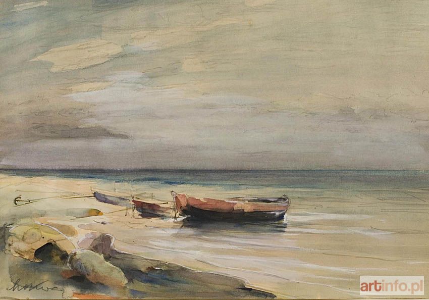 Mokwa malował akwarele i obrazy olejne. Treścią ich były przede wszystkim rodzinne Kaszuby, Pomorze i morskie brzegi. Talent Mokwy poparty rzetelną pracą i gruntowną fachową wiedzą rozsławiły jego nazwisko poza granicami kraju: w Anglii, Szwecji i Niemczech. W 1959 roku jako jedyny Polak wziął udział w wystawie malarstwa marynistycznego w Royal Society oraz Society of British Marina Painters. Jeszcze w młodości artysta złożył śluby poświęcając swój talent malarski polskiemu morzu. Prezentowana akwarela przedstawia trzy zacumowane u morskiego brzegu łodzie.